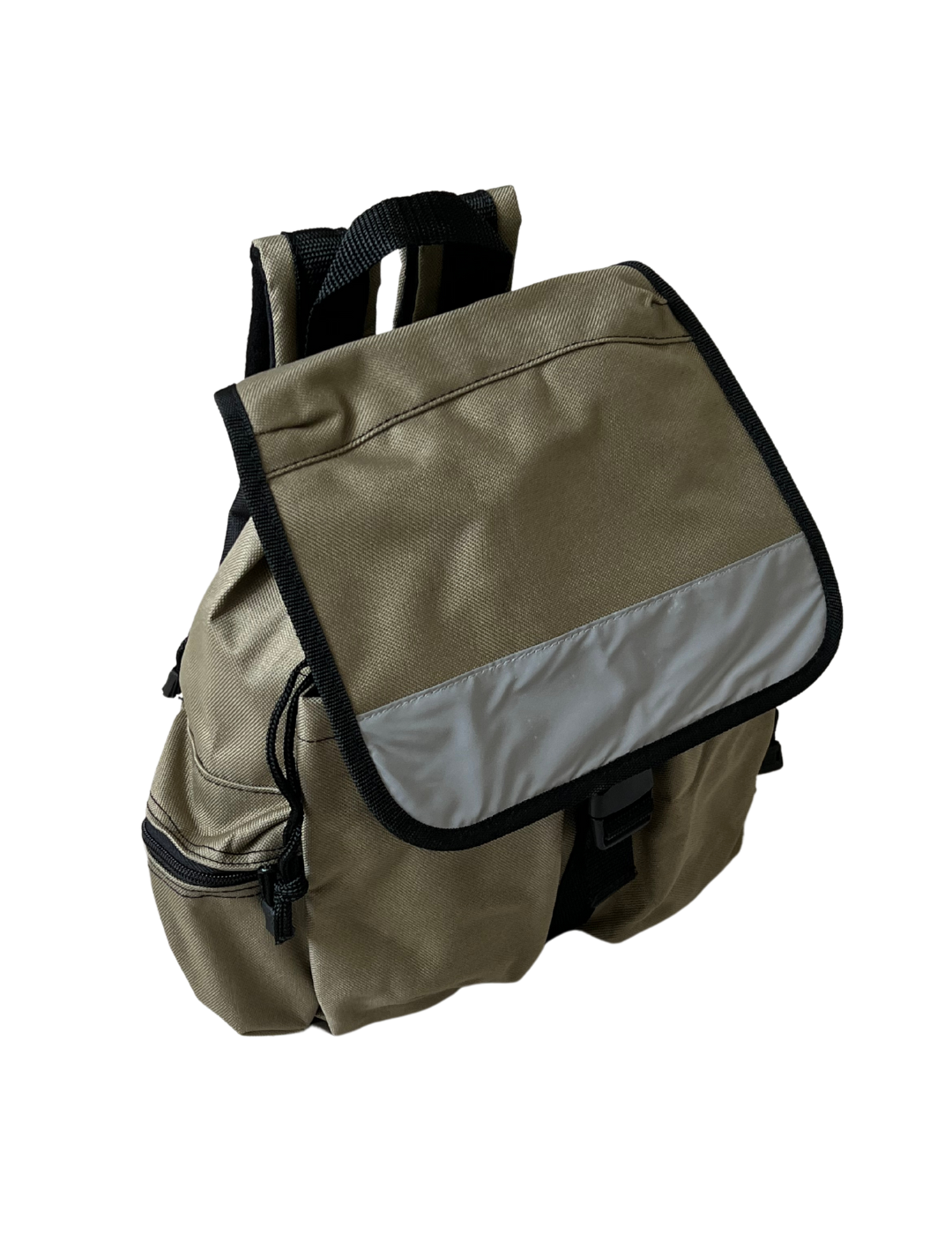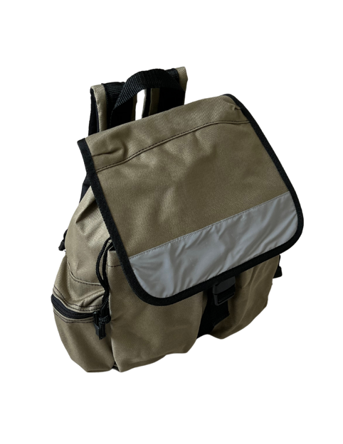 Børnerygsæk i navygrøn med sorte detaljer, og en lang reflex på forsiden. Små rum er fordelt rundt på ydersiden af tasken.