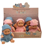 Dukke i lyseblå og lyserød tøj - ligger ass. i display med 6 stk.
